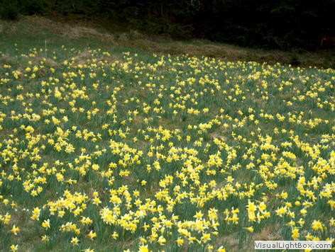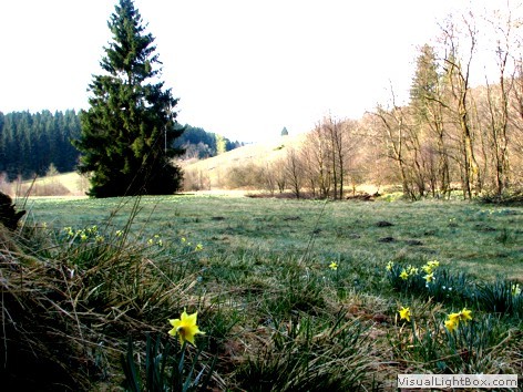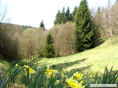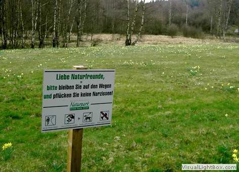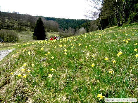 Narzissenwiesen in der Eifel | Ab Ende März findet im Naturschutzgebiet Perlenbach- Fuhrtsbachtal in Höfen ein imposantes Naturereignis statt: Die gelbe, wildwachsende Narzisse verwandelt die Talwiesen und Hänge in gelbe Blütenteppiche. Ca 14 Millionen Narzissen wachsen in dem Naturschutzgebiet. Neben den Narzissen und der herrlichen Landschaft erwarten den Wanderer und den Naturfreunden viele seltene Blumen und Pflanzenarten. Die abgelegenen Bachtäler wurden wahrscheinlich schon im 12. Jahrhundert gerodet und mehr als 600 Jahre lang als Heuwiesen für das Vieh in der Region genutzt. Mit einem speziellen Bewässerungssystem - den sogenannten Flüxgräben - wurden die Heuwiesen jeweils im Vorfrühling mit schwebstoffreichem Bachwasser gedüngt. So wurden über Jahrhunderte die narzissenreichen Bärwurzwiesen, blumenbunten Feucht- und Sumpfwiesen und arnikareiche Borstgrasrasen erhalten. Weil sich die Heuernte nicht mehr lohne, wurden ab etwa 1950 viele Talwiesen mit Fichten aufgeforstet, und die Flüxgräben gerieten in Vergessenheit. Durch den Schatten der Bäume und die dichte Nadelstreu verschwand nach und nach die bunte Pracht der Wiesenblumen und mit ihnen die Vielfalt an Schmetterlingen, Käfern und Vögeln. Um diese Fehlentwicklung zu stoppen, wurde das Gebiet 1976 unter Naturschutz gestellt. Ende der 1980er Jahre wurde auf Initiative der NRW-Stiftung und des Naturparks Nordeifel damit begonnen, die Fichten zu entfernen, und allmählich konnte sich der Artenreichtum in den Wiesen, Sümpfen, Mooren und Auenwälder wieder entfalten.