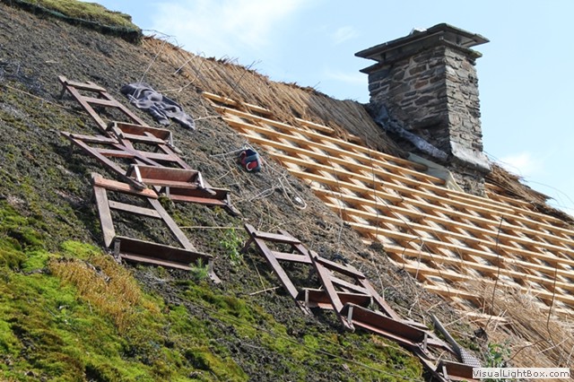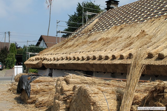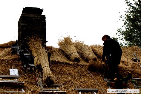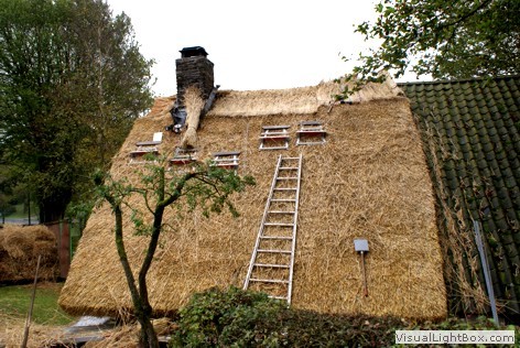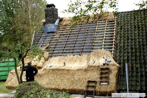 Im Herbst 2011 mußte das im Vergleich zu Reet kurzlebigere Strohdach wieder einmal erneuert werden. Leider gibt es in der Gegend keine Dachdecker mehr, die noch die Kunst des Strohdachdeckens beherrschen.